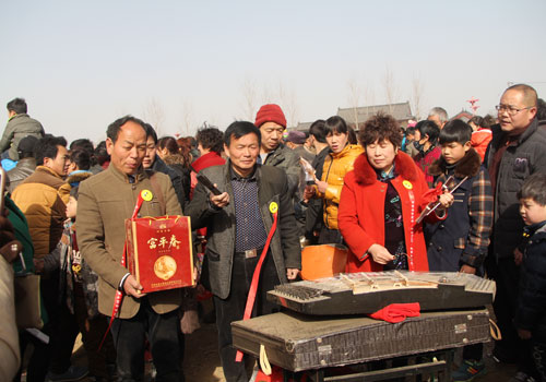這會累了!停下來歇一會!來自安徽界首市的老藝人一曲唱罷,拿起一瓶富平春酒準備喝上兩口。筆者上前問起美酒的來歷,他告訴筆者地上擺著的幾瓶酒都是人家富平春酒業公司人員免費送的,還有掃碼獲得的。 經過采訪得知這位老藝人是安徽省界首市仁寨鄉幸福村的,名叫陳玉雪,是第一次來趕馬街書會,這次他們是組團來的,聯合了附近14個民間藝人一起來趕馬街書會。他18歲開始學戲,今年61歲了還在經常參加當地的一些演出活動。他在書會上亮藝演唱河洛大鼓《打棒槌》、《劉四姐挨打》等段子。 “經常喜歡喝點酒,這不唱累了,喝一點提提勁,再唱!”他還說馬街書會這個大平臺太好了,還有這么多愛戲的群眾,還有熱心周到的服務,在會上還得到了這么好的美酒禮物,明年的書會一定還要來。 古老的馬街書會作為曲藝人的圣地,每年都召喚著他們前來獻藝交流,富平春酒業在書會大派送活動中惦記著這些來自全國各地的民間藝人,為他們送上了富平春美酒來為他們演出助興,拿到酒的藝人都非常高興,一個勁的夸贊富平春酒業想得真周到。